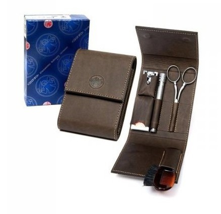 Holiaci súprava vhodná aj na cesty. Puzdro je z veľmi kvalitnej hovädzej kože s magnetom na zapínanie a logom MERKUR Solingen.